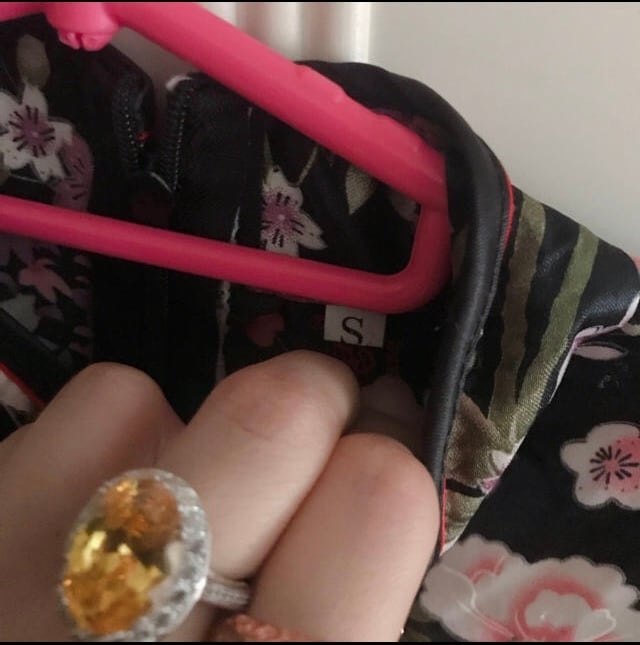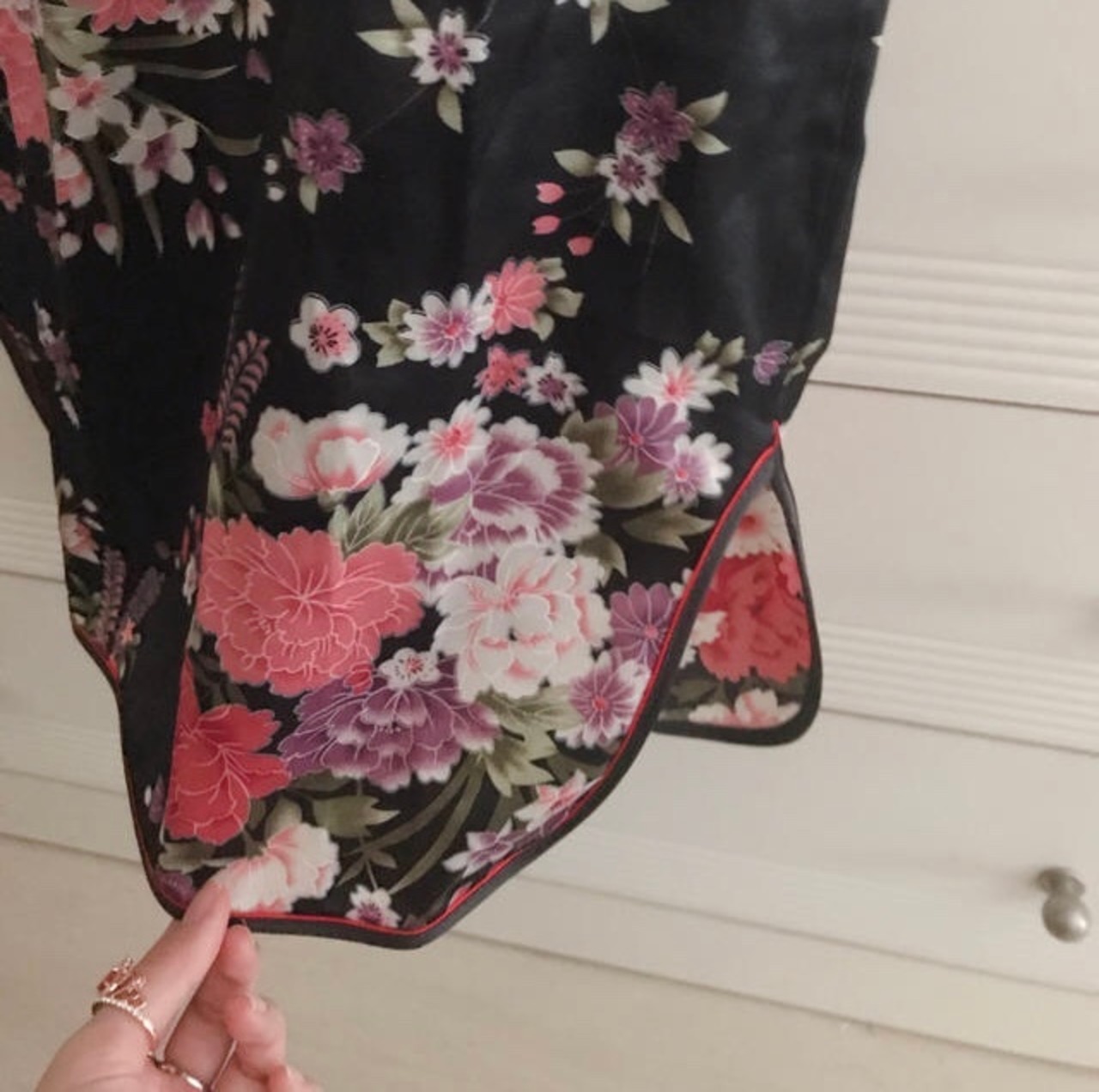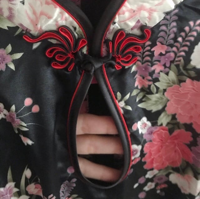 サテン地のツルツルした素材のチャイナドレスです。黒地に赤やピンクのお花デザインでセクシーにもキュートにも着こなせます。胸元のホールがセクシーさを演出してくれます。